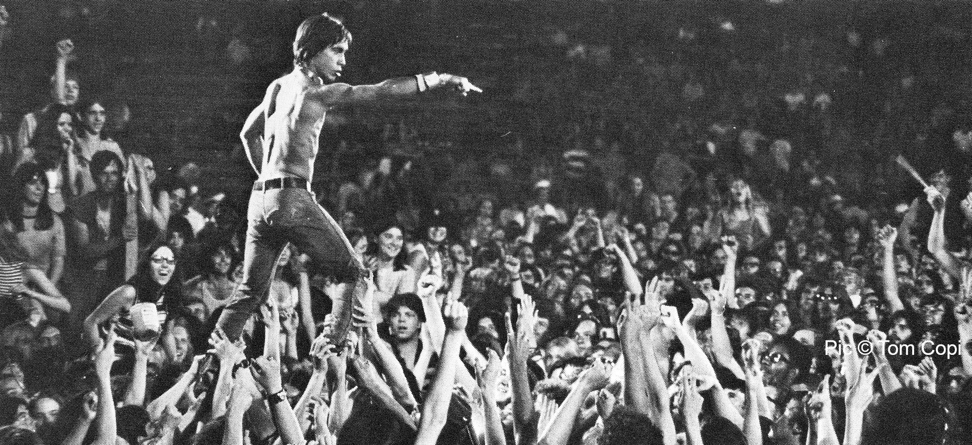 Part 2 begins with Iggy on all fours. He has lost one glove, has no microphone and is shouting wordlessly at the audience. As he straightens up he is obviously searching the floor for the elusive mic and it is eventually handed to him an audience member. Iggy returns the gesture by jumping back into the crowd (where he will remain for the rest of the song) and manages to complete half of another verse before sinking from view. Confusion reigns, you can’t see anything but a heaving mass of tumbling bodies and Iggy’s shouts are interspersed with that weird female voice shrieking. Eventually a spotlight finds its mark and the first person up out of the mess is a woman with a camera, closely followed by Iggy. That is what the screaming was all about- she was on top of him trying to take a photo and her voice was leaking into the vocal mic. She carries on trying to take photos from close quarters as she (and Iggy) are being jostled from all sides. He eventually abandons the mic by throwing it back onto the stage and climbs onto people’s shoulders. They are holding him up by the ankles when he points at something off screen and that iconic shot is played out. He is showing off, baiting the audience, alternately joining in their game and then mocking them. Then he is holding something, a can or a jar, and is smearing the contents over his chest and flinging handfuls in the air and at audience members. It’s the peanut butter incident, for a long time a rock ‘n’ roll legend, now in its full glory for all to see. The camera angle changes to close up as Iggy is swallowed up by the audience again eventually surfacing, with the help of a number of teenage girls, close to the stage. Gasping, filthy and bedraggled he is helped back onstage as the footage ends.