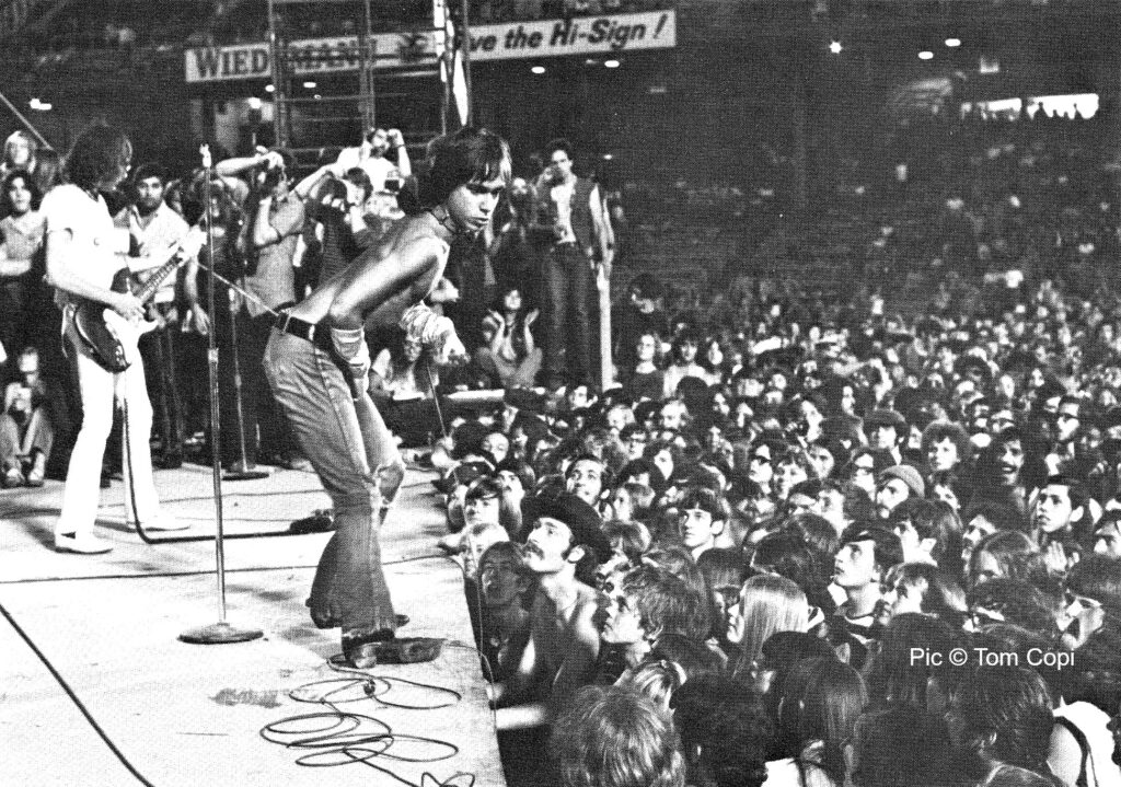 They were the same tracks and the sleeve also had a photo of Iggy at this very concert. It’s a fantastic image of him standing bare-chested among a sea of raised hands with his right arm pointing off camera and is a great teaser for what the television footage must be like. Alas, my friend had never seen and had no idea of how to get hold of this footage and we both agreed that it must be presumed lost, otherwise the Stooges collectors grapevine would surely be aware of it. Film of the Stooges live is the holy grail for him but he’s never heard of the existence of any (although there is considerable excitement later that year, when a bootleg video of a Dutch TV biography of Iggy turns up that not only features an interview about the early days with Stooges guitarist Ron Ashton but also features about 30 seconds of silent black and white footage of the band live). The situation deepens a couple of years later, when I find a copy of Iggy and Anne Wehrer’s book ‘I Need More’ which features more pics from this event with a comment from Iggy stating “…the event was filmed and later televised on NBC, coast to coast, as ‘A Midsummer Nights Rock’. The ratings were phenomenal”. He also confirms that the announcer was Jack Lescoulie from ‘The Jackie Gleason Show’. Whatever and whoever that is, I had no idea.