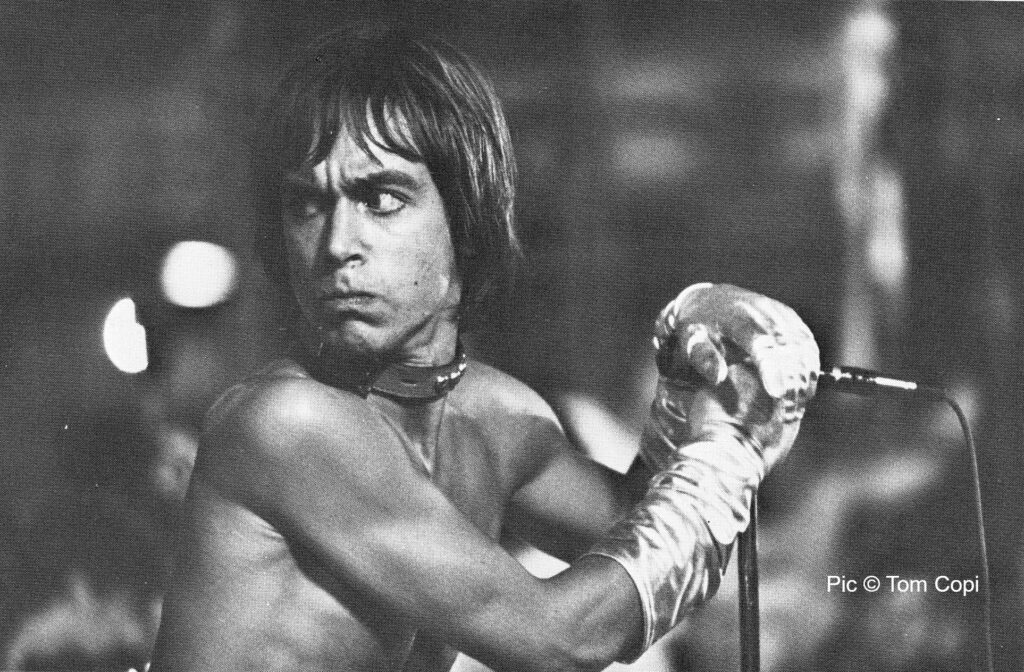 The first shot of the band is over the neck of Ron Ashton’s guitar and is of a very young Iggy bending over the front row of the audience. He is bare chested and is wearing tight jeans, a spiked dog collar and silver gloves. His naked torso is drenched with sweat and he is bawling into a small silver coloured microphone. He straightens up as the verse finishes, the camera turns to follow him and bass player Dave Alexander comes into view, leaning back as he digs into a Mosrite bass guitar.